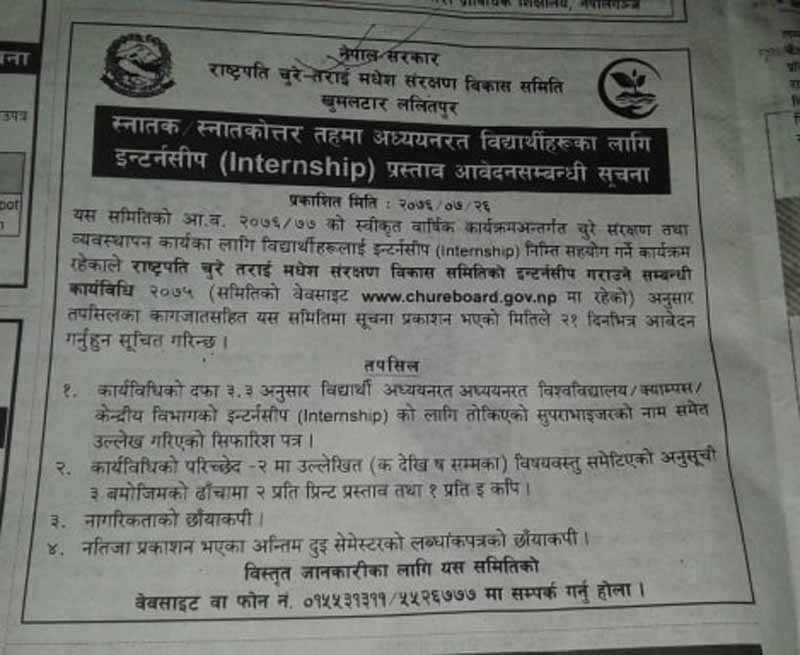 २६ कार्तिक, ललितपुर । नेपाल सरकार राष्ट्रपति चुरे- तराई मधेश संरक्षण विकास समिति खुमलटार ललितपुरले इन्टर्नसीप प्रस्ताव आवेदनसम्बन्धी सूचना प्रकाशित गरेको छ ।