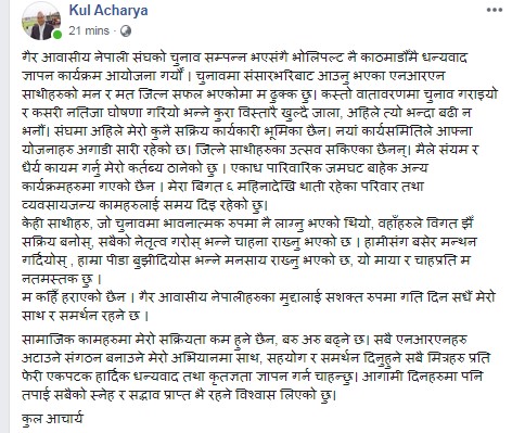 ‘केही साथीहरु, जो चुनावमा भावनात्मक रुपमा नै लाग्नु भएको थियो, वहाँहरुले विगत झैँ सक्रिय बनोस्, सबैको नेतृत्व गरोस् भन्ने चाहना राख्नु भएको छ । हामीसँग बसेर मन्थन गर्दियोस्, हाम्रा पीडा बुझीदियोस् भन्ने मनसाय राख्नु भएको छ, यो माया र चाहप्रति म नतमस्तक छु’ आचार्यले भनेका छन्, ‘म कहिँ हराएको छैन । गैर आवासीय नेपालीहरुका मुद्दालाई सशक्त रुपमा गति दिन सधैं मेरो साथ र समर्थन रहने छ ।’