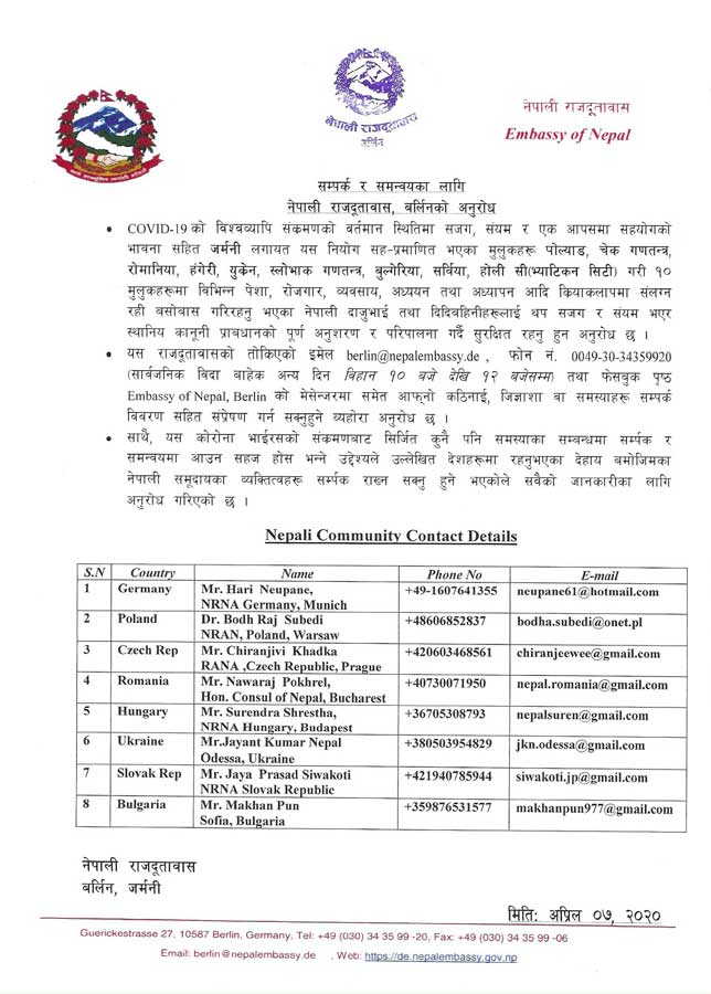 त्यस्तै दूतावासको तोकिएको इमेलberlin@nepalembassy.de फोन नम्बर ००४९–३०–३४३५९९२०, मा सार्वजनिक विदा बाहेक अन्य दिन (बिहान १० देखि १२ बजेसम्म) तथा फेसबुक Embassy of Nepal, Berlin को मेसेन्जरमा समेत आफ्ना कठिनाई, जिज्ञासा वा समस्याहरुमा सम्पर्क विवरणसहित सम्प्रेषण गर्न सक्ने पनि दूतावासले जनाएको छ ।