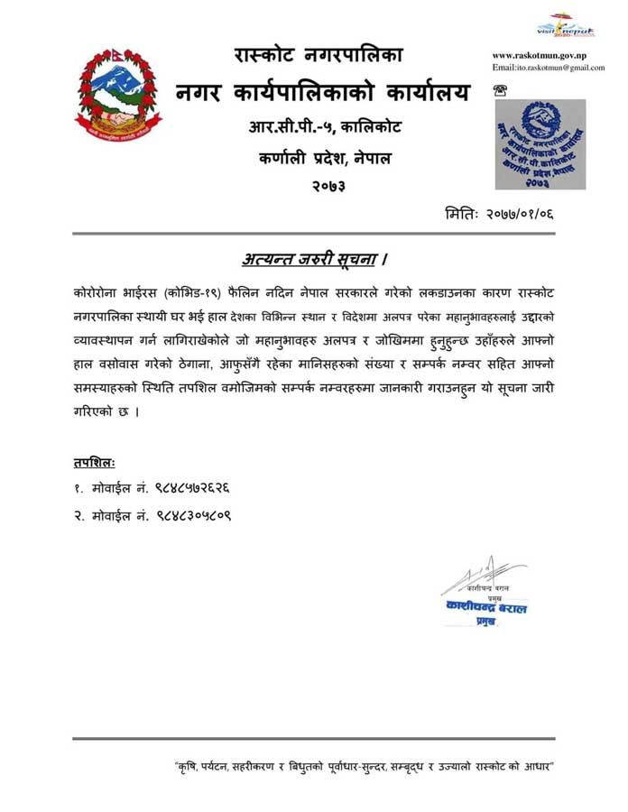 ७ बैशाख, कालिकोट । कर्णाली प्रदेशको रास्कोट नगरपालिका कालिकोटले देशभरी रहेका आफ्ना नागरिकको लागि बलियो अभिभावकको भूमिका निभाउने प्रयासमा लागेको छ ।