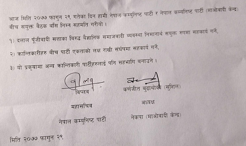 शनिबार बसेको संयुक्त बैठकमा दुई पार्टी बीच तीन बुँदे सहमति भएको हो । सहमति पत्रमा विप्लव र कर्णजीत बुढाथोकी ‘सुशील’ ले हस्ताक्षर गरेका छन् ।
