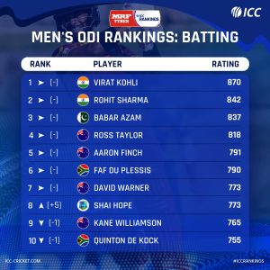 एकदिवसीय क्रिकेटको वरियता तर्फ भने विराट कोहली शिर्ष स्थानमा रहेको छ । त्यसैगरी दोस्रो स्थानमा रोहित शर्मा र तेस्रो स्थानमा बाबर आहजम रहेका छन । वेस्टइंडिजका साई होप ५ स्थानमा माथि उक्लिदैँ आठौँ स्थानमा आएका छन । न्यूजिल्याण्डक कप्तान केन विलियमसन र क्विनटन डि ककले भने १-१ स्थान गुमाएका छन ।