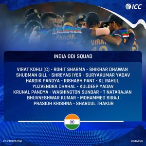 भारतको एकदिवसीय टिममा पहिलो पटक ब्याट्सम्यान सूर्याकुमार यादव, अलराउण्डर कुनाल पांड्या र फास्ट बलर प्रसिद्ध कृष्णले मौका पाएका छन । सुर्याकुमार यादवले इंल्याण्ड विरुद्ध जारी टि २० श्रृखलाको चौथो खेलमा उत्कृष्ट ब्याटिङ्ग गरेको थिए ।त्यसैगरी अलराउण्डर कुनाल पांड्या र फास्ट बलर प्रसिद्ध कृष्णले भखरै समाप्त विजय हजारे ट्रफीमा उत्कृष्ट प्रदर्शन गरेका थिए । अष्ट्रेलिया विरुद्धको एकदिवसीय श्रृखलामा टिममा पर्न सफल भएका मनिस पाण्डे, मयंक अग्रवाल, संजु श्यामसन, रविन्द्र जडेजा, मोहम्मद शमी र जसप्रीत बुमराह भने टिमबाट बाहिरिएका छन ।