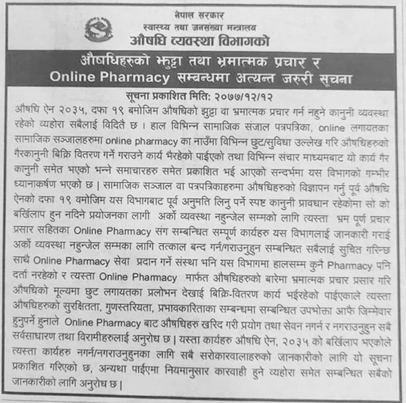 अनलाइन फार्मेसीले विभिन्न छुट/सुविधा भन्दै गैरकानुनी रुपमा सामाजिक सञ्जालहरुमा प्रचार प्रसार गरिएको प्रति गम्भिर ध्यानाकर्षण भएको जनाएको छ ।