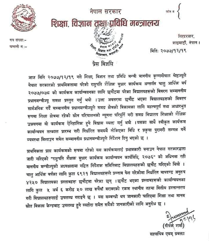 छनौटमा परेका विद्यालयहरुको विवरण सार्वजनिक गर्दै बिहिबार प्रधानमन्त्री केपी शर्मा ओलीले समग्र विद्यालय शिक्षाको शैक्षिक उन्नयनमा यो कार्यक्रम ऐतिहासिक हुने विचार व्यक्त गरे