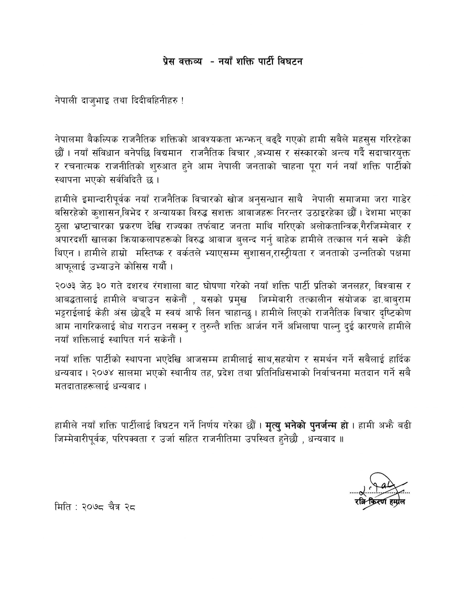 उनै बाबुराम भट्टराईले बैकल्पिक शक्तिका रुपमा रुपमा खोलेको नयाँशक्ति पार्टीमा बाबुरामसँग असन्तुष्ट रहेकाहरुले नयाँशक्तिलाई निरन्तरता दिँदै आएका थिए । असन्तुष्ट पक्षबाट रबिकिरण हमालले नयाँ शक्तिको नेतृत्व गर्दै आएपनि ‘मृत्यु भनेको पुनर्जन्म हो’ भन्दै चैत २८ गते (सोमबार) उक्त पार्टी विघटन भएको हमालले प्रेस विज्ञप्तिमार्फत् जानकारी दिएका छन् ।