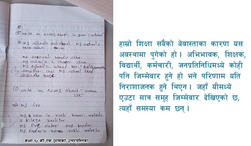 धेरै विद्यार्थीले प्रयोगात्मक परीक्षामा ‘एं’ वा ‘बीं’ ल्याएको देखिन्छ । तर तिनै विद्यार्थीले लिखितमा चाहिं ‘डी’, ‘इ’ आदि ल्याएका छन् । प्रयोगात्मक र लिखित परीक्षामा यति धेरै ‘ग्याप’ त नहुनुपर्ने हो भन्ने लागेर केही स्कूलका एसईई उत्तीर्ण विद्यार्थीलाई आफ्नो बारेमा नेपालीमा र अंग्रेजीमा दश–दश लाइन लेख्न लगाएँ । कक्षा ११ मा शिक्षा विषय लिएर पढ्दै गरेका ती किशोरीहरूलाई कक्षा ५ का विद्यार्थीलाई आउनुपर्ने जति पनि लेख्न नआएको देखेर म स्तब्ध भएँ ।