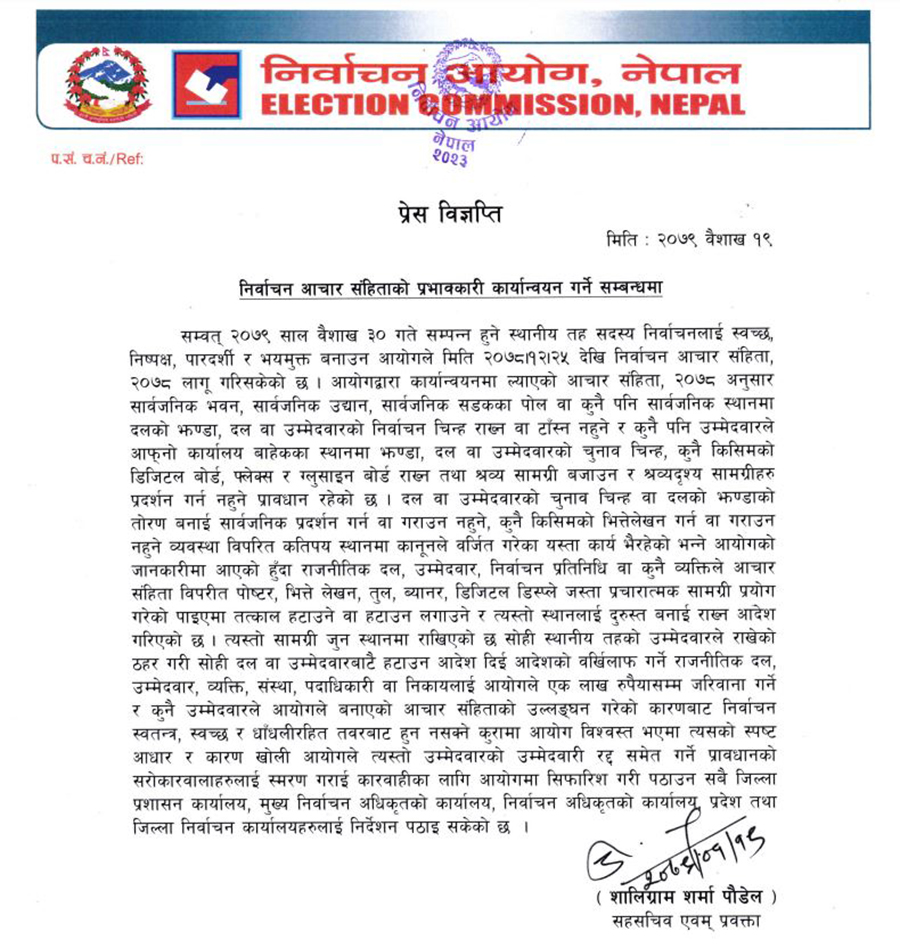 राजनीतिक दल, उम्मेदवार, निर्वाचन प्रतिनिधि वा कुनै व्यक्तिेले आचारसंहिता विपरीत पोष्टर, भित्ते लेखन, तुल, व्यानर, डिजिटल, डिस्प्ले जस्ता प्रचारात्मक सामग्री प्रयोग गरेको पाइएमा तत्काल हटाउने वा हटाउन लगाउने र त्यस्तो स्थानलाई दुरुस्त बनाई राख्न समेत आयोगले आग्रह गरेको छ ।