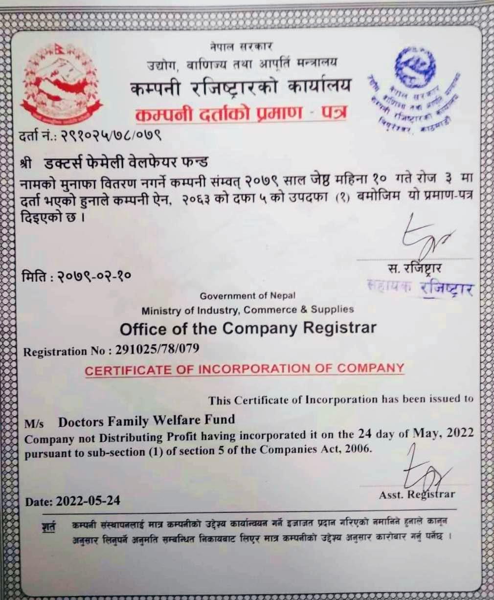 काठमाडौँ । आर्थिक रुपले कमजोर डाक्टरहरु तथा उनका परिवारको अधिकारका लागि नेपाली डाक्टरहरुको एक समूहले ‘डक्टर्स फेमेली वेलफेयर फन्ड’ नामक संस्था दर्ता गरेका छन् ।