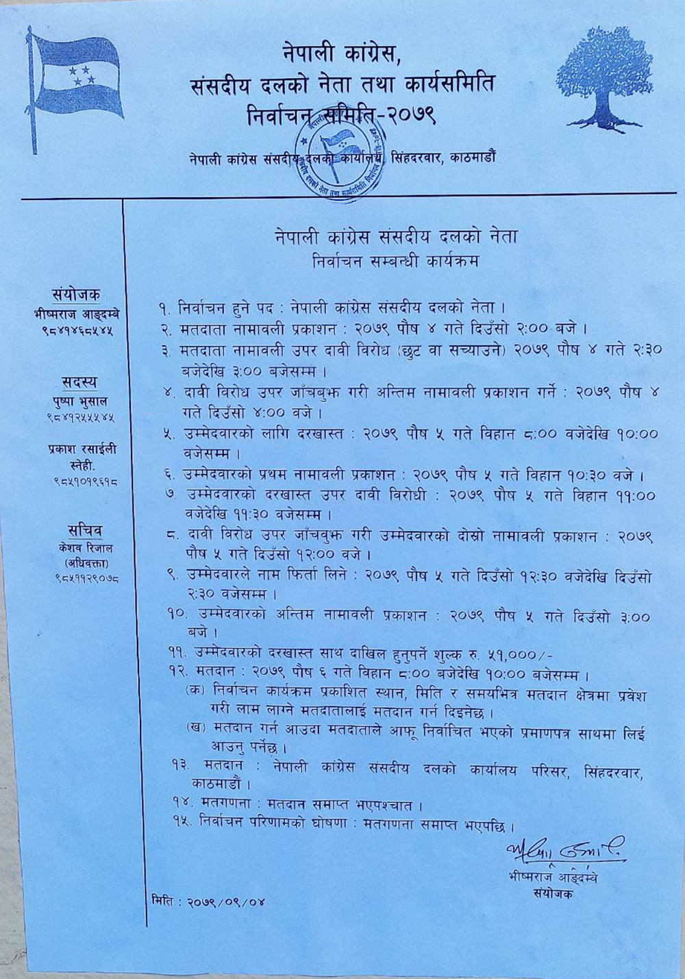 पार्टीका सहमहामन्त्री तथा निर्वाचन समितिका संयोजक भीष्मराज आङ्देम्बेद्धारा जारी गरिएको सूचनामा भोली दिउँसो २ बजे मतदाता नामावली प्रकाशन, मतदाता नामावली उपर दावी विरोध २ः३० भित्रमा, दावी विरोध उपर जाँचबुँझ गरी अन्तिम नामावली प्रकाशन बेलुका ४ बजेभित्र गरिने सूचनामा उल्लेख गरिएको छ ।