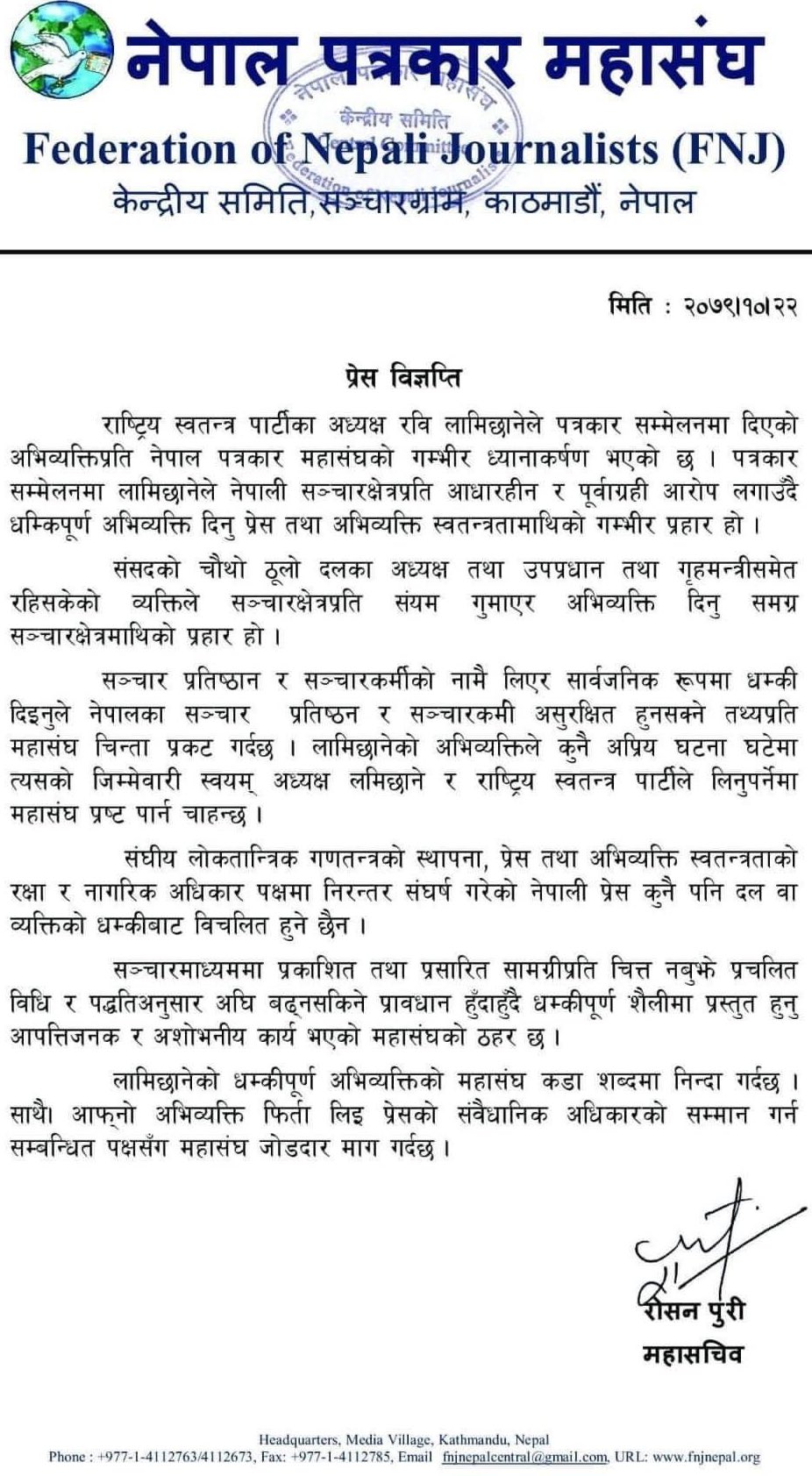 ‘पत्रकार सम्मेलनमा लामिछानेले नेपाली सञ्चारक्षेत्रप्रति आधारहीन र पूर्वाग्रही आरोप लगाउँदै धम्किपूर्ण अभिव्यक्ति दिनु प्रेस तथा अभिव्यक्ति स्वतन्त्रतामाथिको गम्भीर प्रहार हो ।’ महासंघका अध्यक्ष रोशन पुरीद्धारा आइतबार बेलुका जारी विज्ञप्तिमा भनिएको छ ।