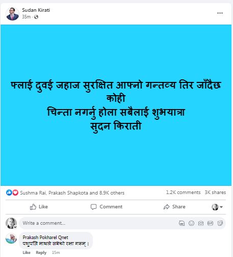 ‘फ्लाई दुवई जहाज सुरक्षित आफ्नो गन्तव्य तिर जाँदैछ कोही चिन्ता नगर्नु होला सबैलाई शुभयात्रा ।’ मन्त्री किरातीले सामाजिक संजालमा लेखेका छन् ।