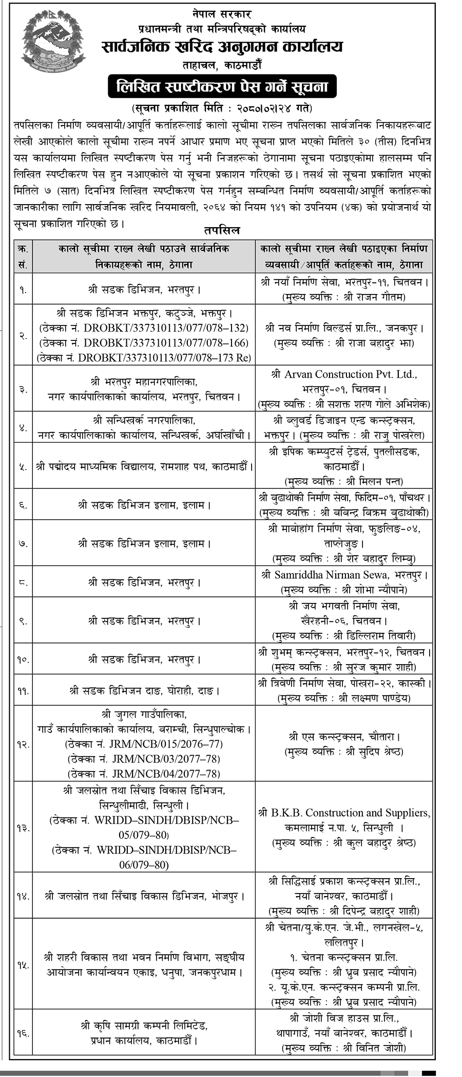 कार्यालयले राजन गौतम मु्ख्य व्यक्ति रहेको श्री नयाँ निर्माण सेवा भरतपुर चितवन, राज बहादुर झा मुख्य व्यक्ति रहेको श्री नव निर्माण विल्डर्स प्रा.लि जनकपुर लगायतका १६ कम्पनीलाई सातदिने लिखित स्पष्टीकरण सोधेको हो ।