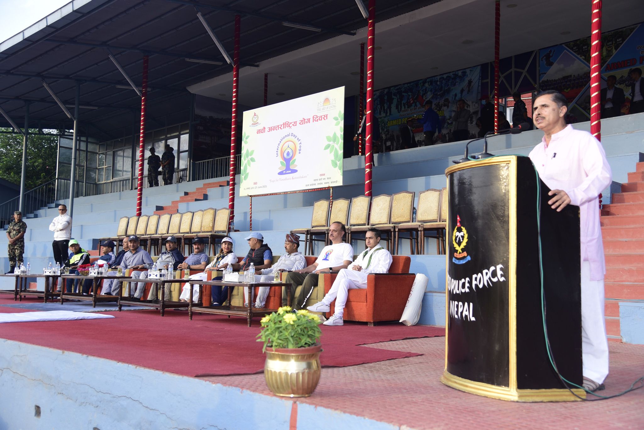 अन्तर्राष्ट्रिय योग दिवसको अवसरमा सशस्त्र प्रहरी बल नेपाल प्रधान कार्यालय हल्चोकस्थित रङ्गशालामा आज आयोजित योग अभ्यासमा सरिक हुँदै उपप्रधानमन्न्त्री नारायणकाजी श्रेष्ठले स्वस्थ जीवनयापनमा योग, ध्यान र व्यायामले फाइदा पुग्ने बताएका छन् ।