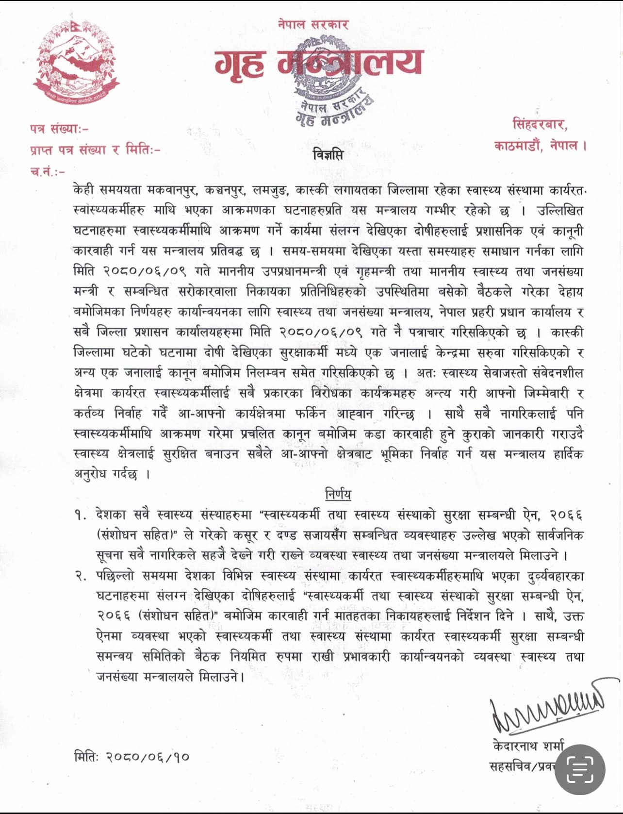 त्यस्तै पछिल्लो समय देशका विभिन्न स्वास्थ्य संस्थामा कार्यरत स्वास्थ्यकर्मीहरुमाथि भएका दुव्र्यवहारका घटनाहरुमा संलग्न देखिएका दोर्षिहरुलाई ‘स्वास्थ्यकर्मी तथा स्वास्थ्य संस्थाको सुरक्षा सम्बन्धी ऐन, २०६६ (संशोधनसहित)’ बमोजिक कारबाही गर्न मातहतका निकायलाई निर्देशन दिने समेत उक्त विज्ञप्तिमा उल्लेख छ ।
