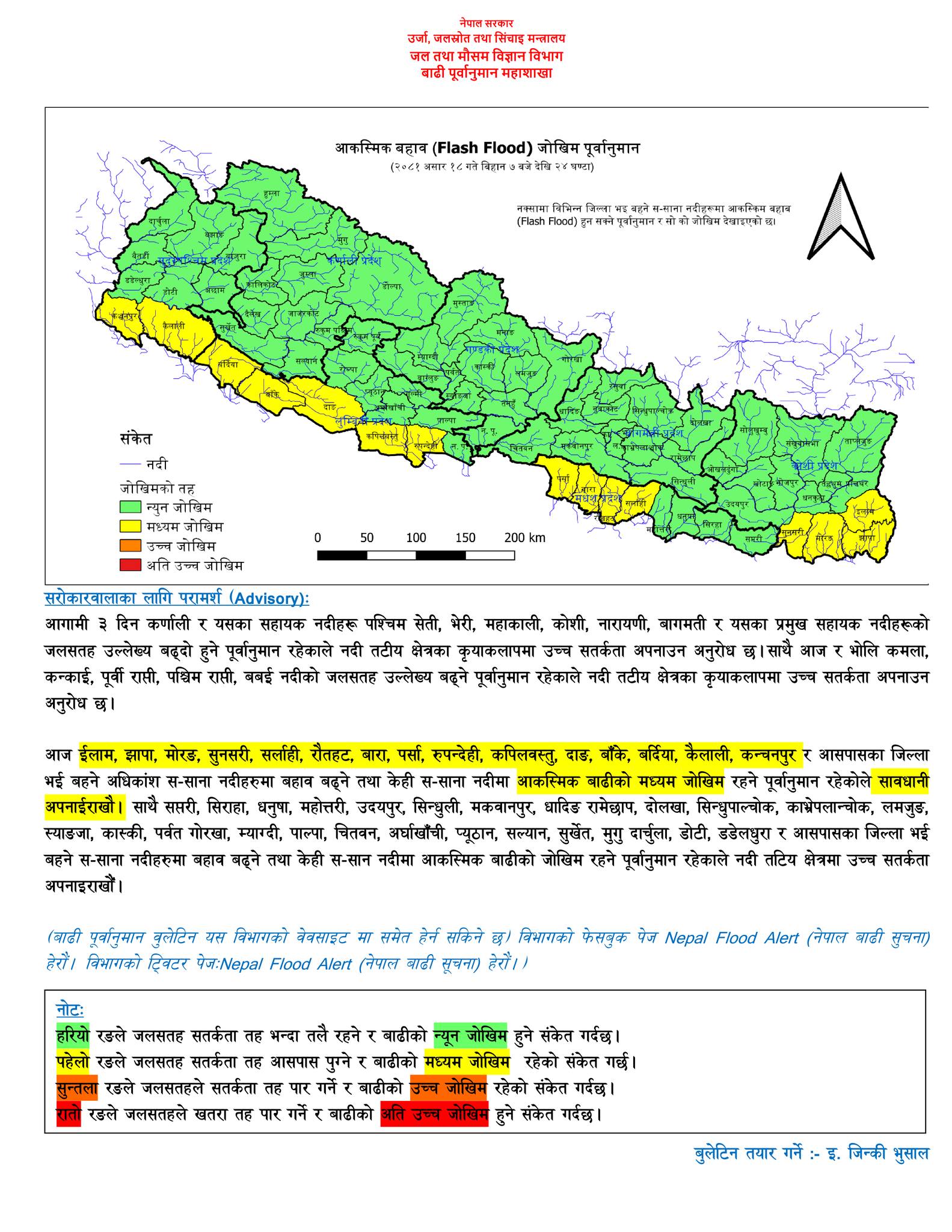 त्यस्तै आज इलाम, झापा, मोरङ, सुनसरी, सर्लाही, रौतहट, बारा, पर्सा, रुपन्देही, कपिलवस्तु, दाङ, बाँके, बर्दिया, कैलाली, कन्चनपुर लगायतका आसपासका जिल्लाका नदीहरुमा आकस्मिक बाढीको मध्यम जोखिम रहने पूर्वानुमान गरिएकोले सावधानी अपनाउन समेत महाशाखाले अनुरोध गरेको छ ।