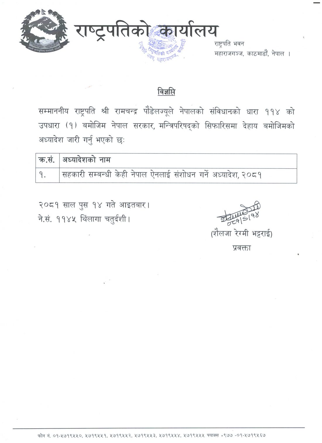 काठमाडौँ । राष्ट्रपति रामचन्द्र पौडेलले सहकारीसम्बन्धी अध्यादेश जारी गरेका छन् । मन्त्रिपरिषद्को सिफारिसमा राष्ट्रपति रामचन्द्र पौडेलले सहरकारीसम्बन्धी केही नेपाल ऐनलाई संशोधन गर्ने, अध्यादेश आइतबार जारी गरेका हुन् ।