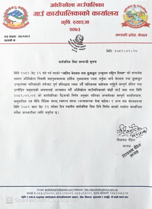स्याङ्जा । स्याङ्जाको आँधीखोला गाउँपालिकाले ‘जातीय भेदभाव तथा छुवाछुत उन्मुलन राष्ट्रिय दिवस’का दिन सार्वजनिक बिदा दिने निर्णय गरेको छ ।