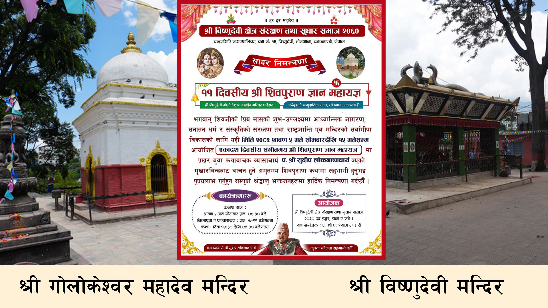 काठमाण्डौ जिल्ला चन्द्रागिरि नगरपालिका वडा नं. १५ तीनथानामा अवस्थित ऐतिहासिक श्री विष्णुदेवी मन्दिर क्षेत्रमा शिव महापुराण महायज्ञ हुने भएको छ । यही श्रावण ५ गतेदेखि १५ गते सम्म एकादशदिवसीय सङ्गीतमय श्री शिवपुराण ज्ञान महायज्ञ हुने भएको हो ।