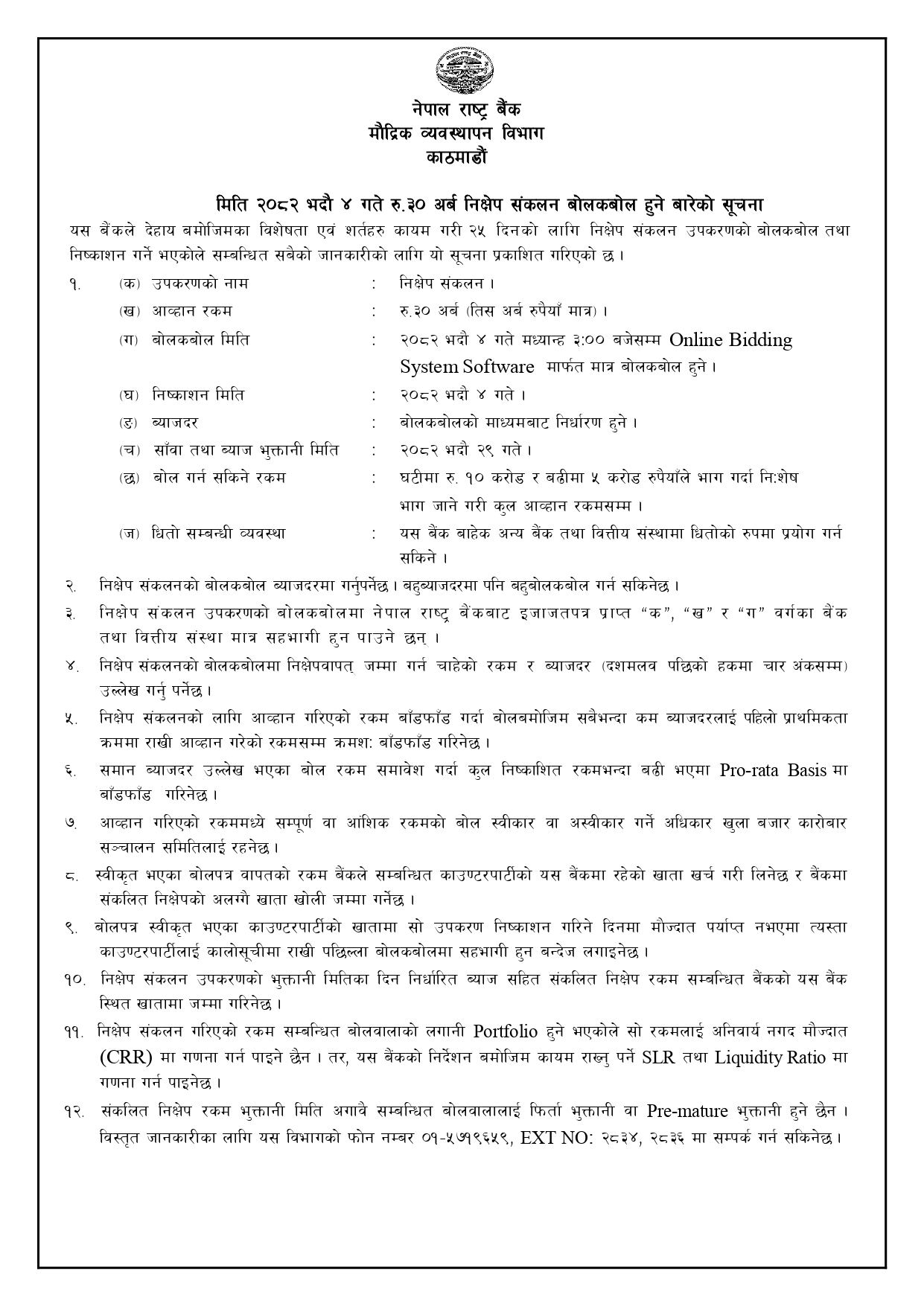 गत आर्थिक वर्षमा ८० पटकभन्दा बढी यो उपकरणको प्रयोग गरेको राष्ट्र बंैंकले चालु आर्थिक वर्षको एक महिना र केहि दिनमानै नौ पटक यो उपकरणमार्फत निक्षेप संकलन गरिसकेको छ ।