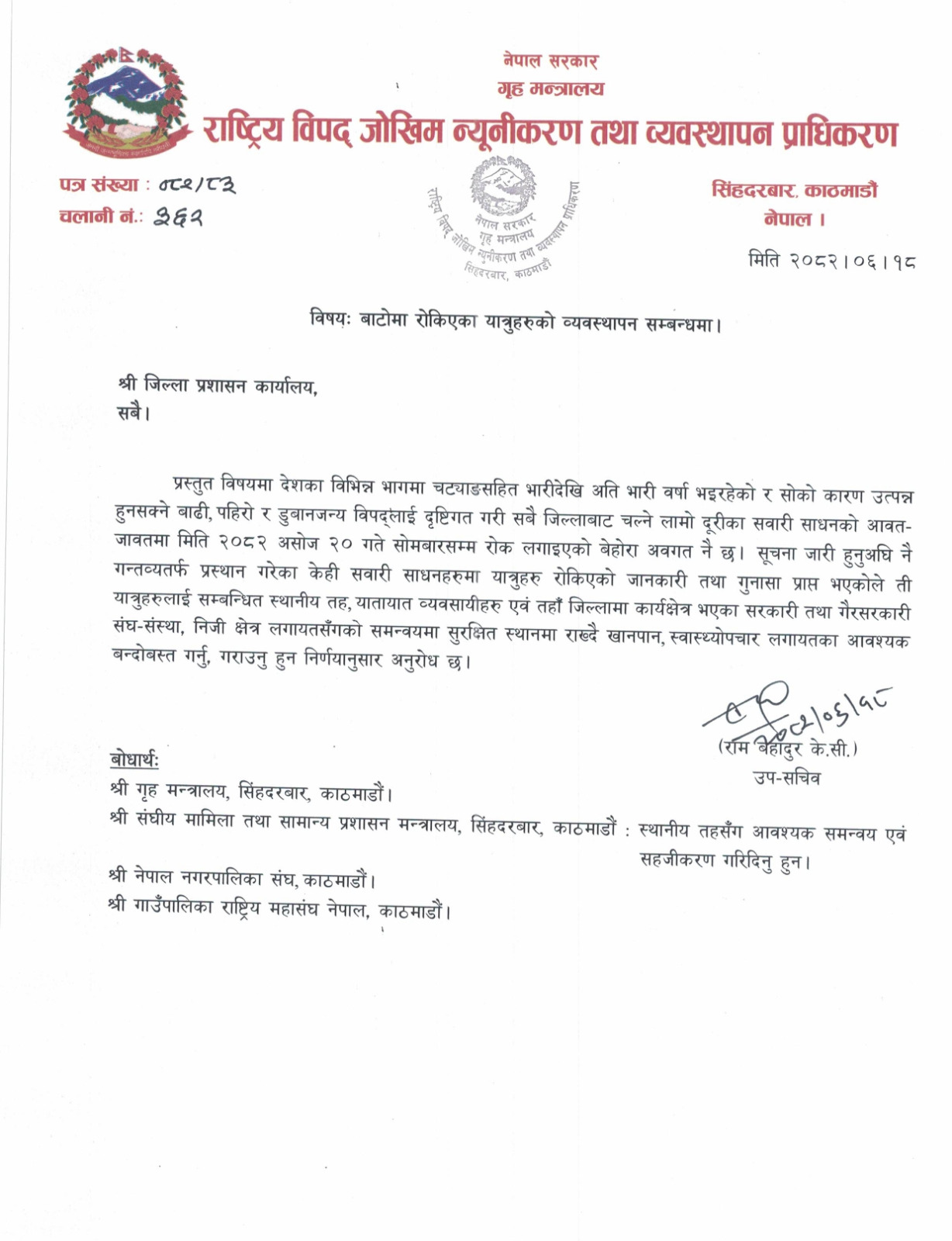 देशभर अविरल वर्षाका कारण उत्पन्न समस्या र राष्ट्रिय राजमार्गमा अलपत्र हजारौं यात्रुको अवस्थालाई मध्येनजर गर्दै मन्त्रालयको राष्ट्रिय विपद् जोखिम न्युनिकरण तथा व्यवस्थापन प्राधिकरणले यस्तो अनुरोध गरेको हो ।