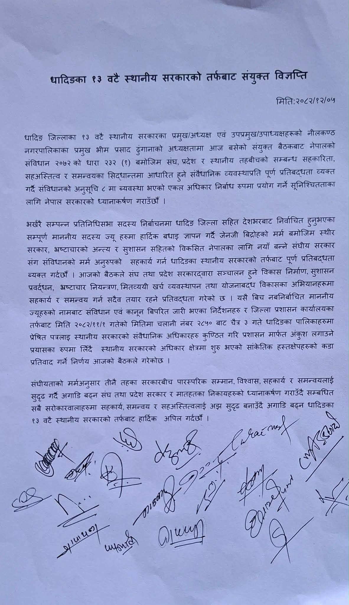 धादिङ । धादिङ जिल्लाका १३ वटै स्थानीय तहले संयुक्त विज्ञप्ति जारी गर्दै संघ तथा प्रदेश सरकारबाट स्थानीय तहको संवैधानिक अधिकारमा हस्तक्षेप नगर्न चेतावनी दिएका छन्।